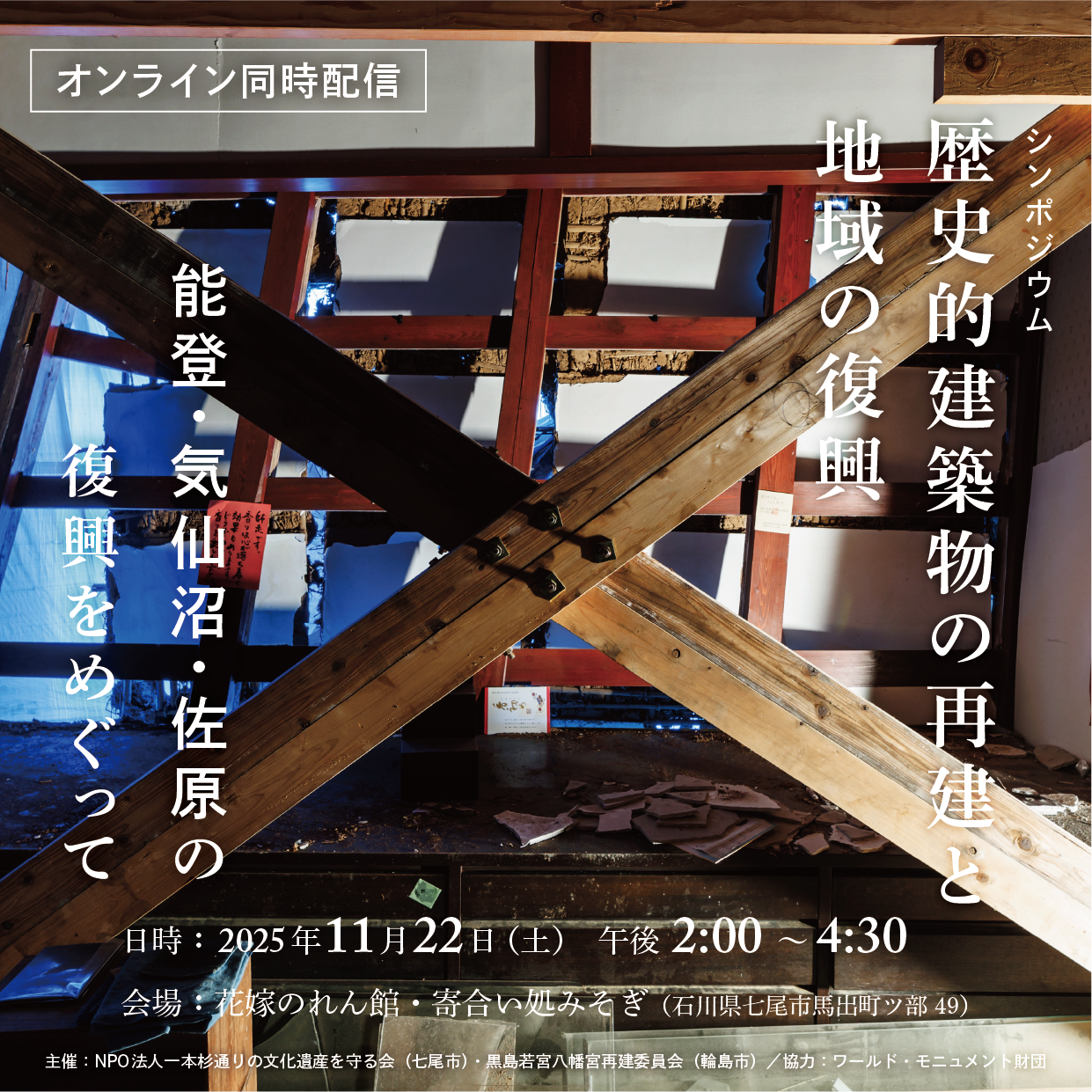 NPO 法人一本杉通りの文化遺産を守る会は、黒島若宮八幡宮再建委員会(輪島市)と共同で、シンポジウム「歴史的建築物の再建と地域の復興:能登・気仙沼・佐原の復興をめぐって」を開催します。